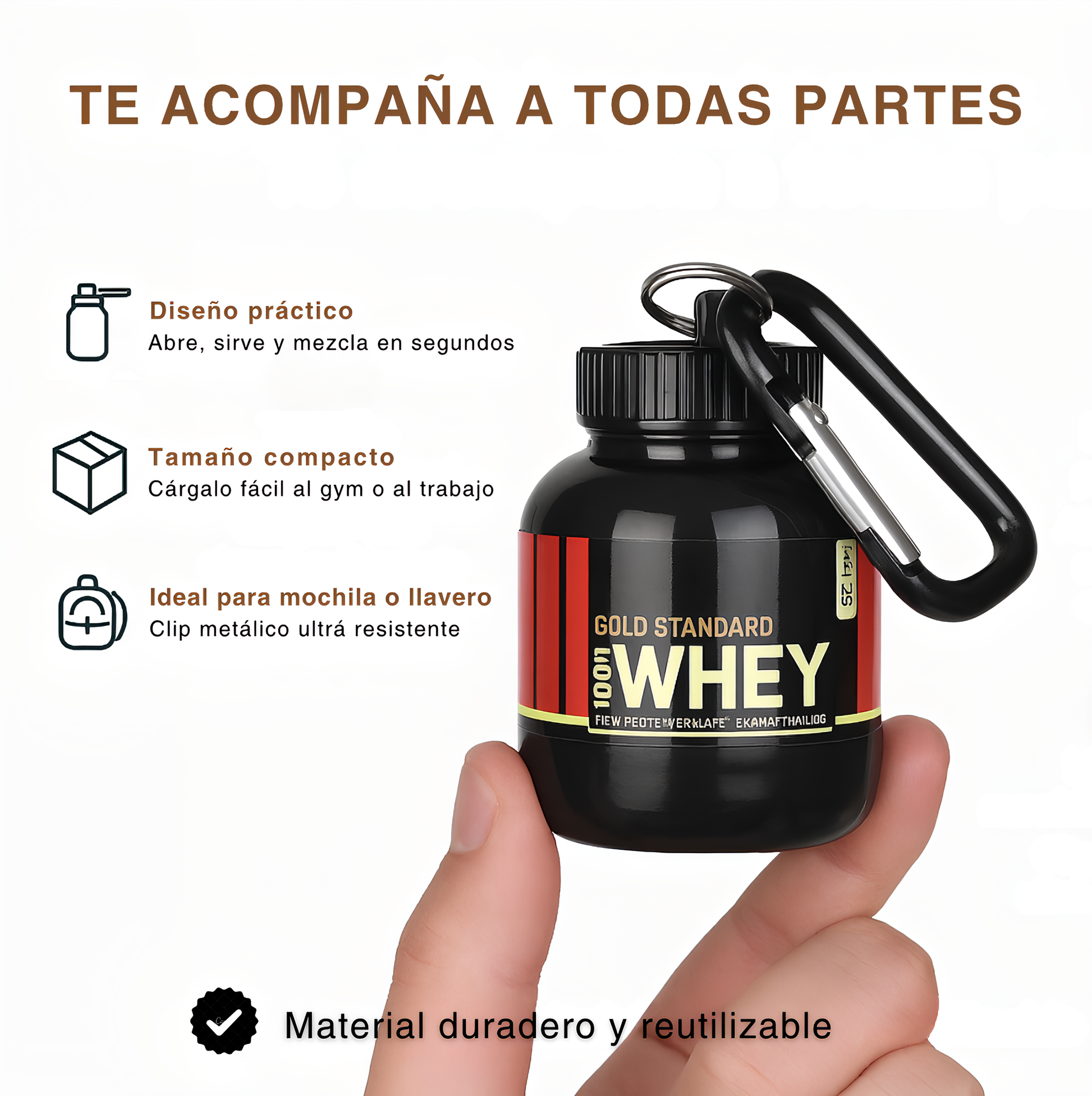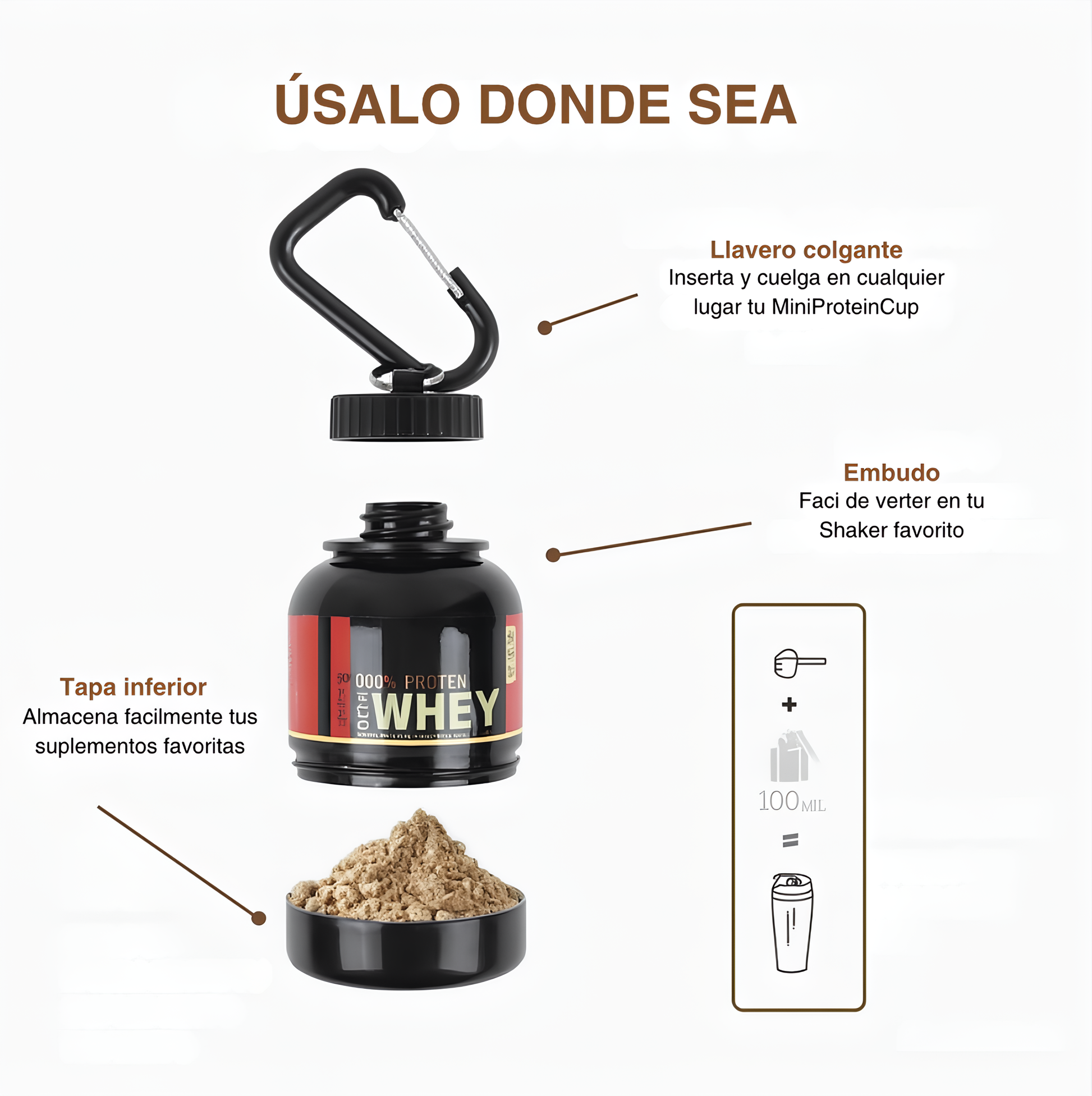 Nuestro MiniProteinCup tiene espacio para 1 porción estándar de proteína en polvo (20–30g aprox.), lo justo para tu shake post-entreno o una recarga rápida de suplementos.