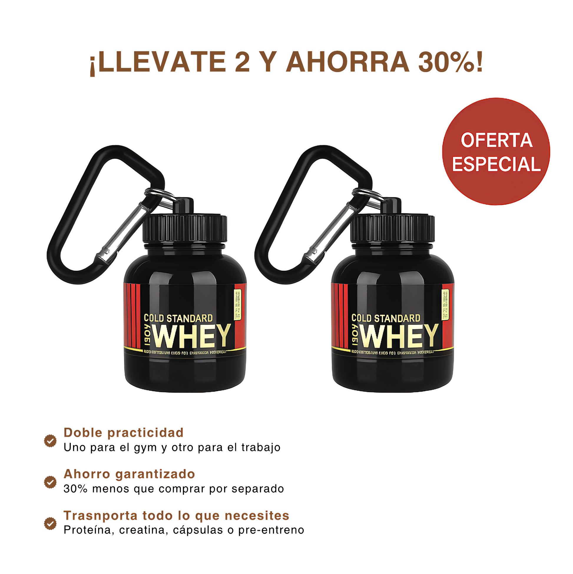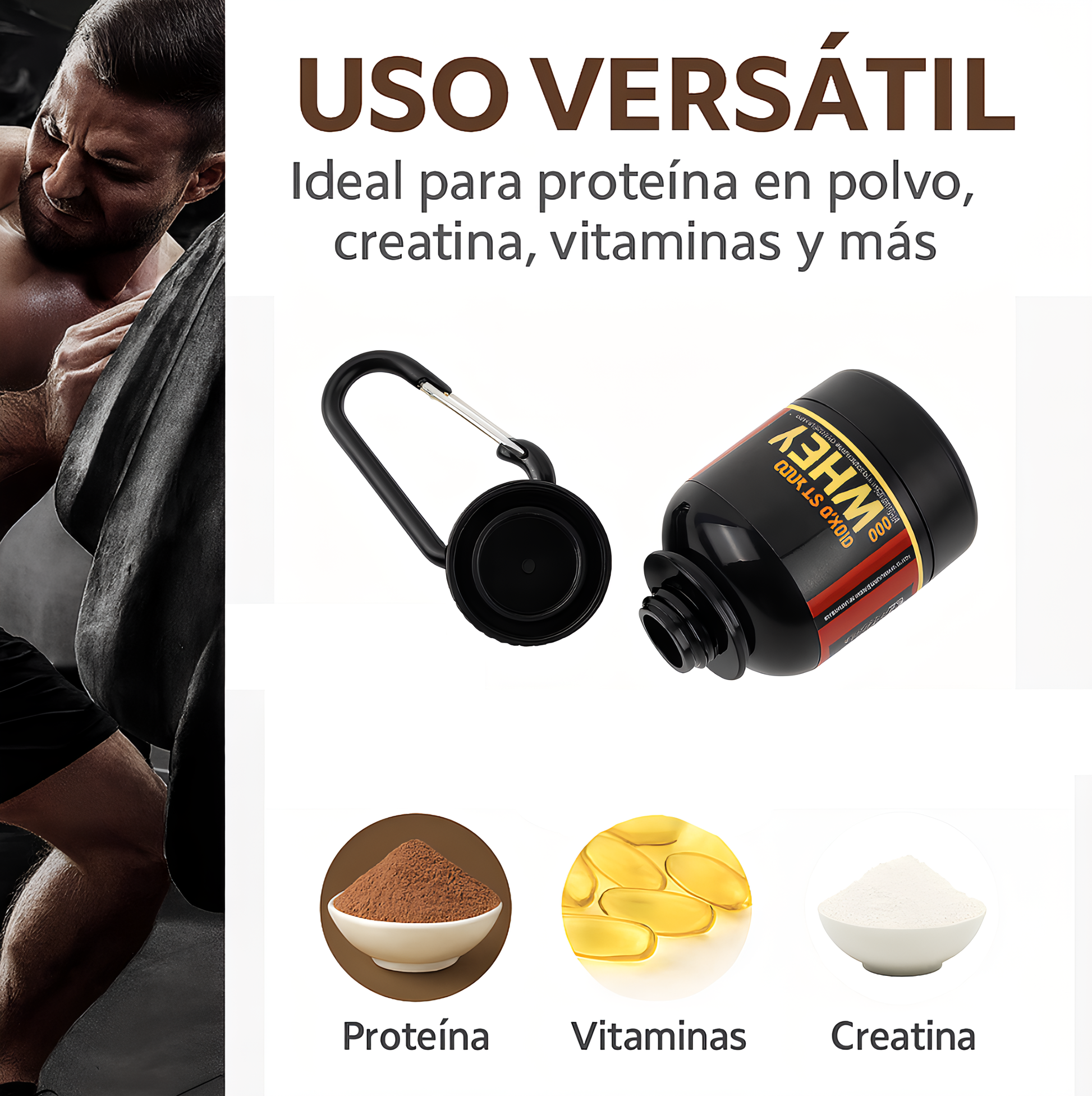 No importa si usas proteína, creatina o vitaminas. Con este sistema puedes llevar diferentes opciones en un solo envase compacto.