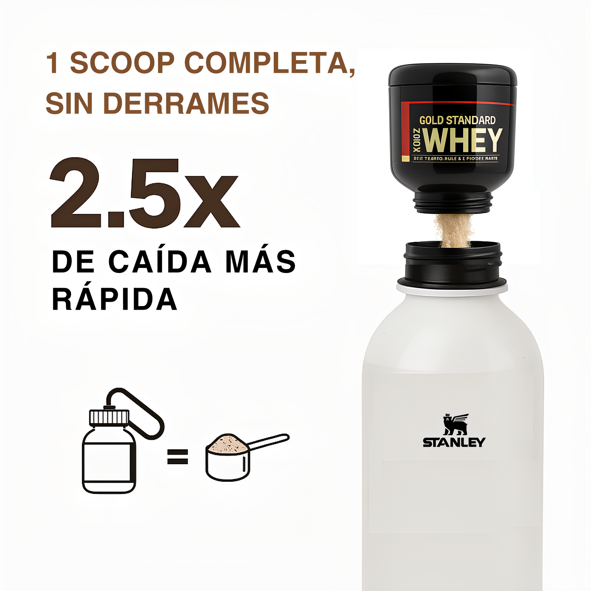 Nuestro diseño permite que el suplemento caiga directo en tu shaker sin ensuciar nada. Práctico para quienes no quieren perder tiempo.